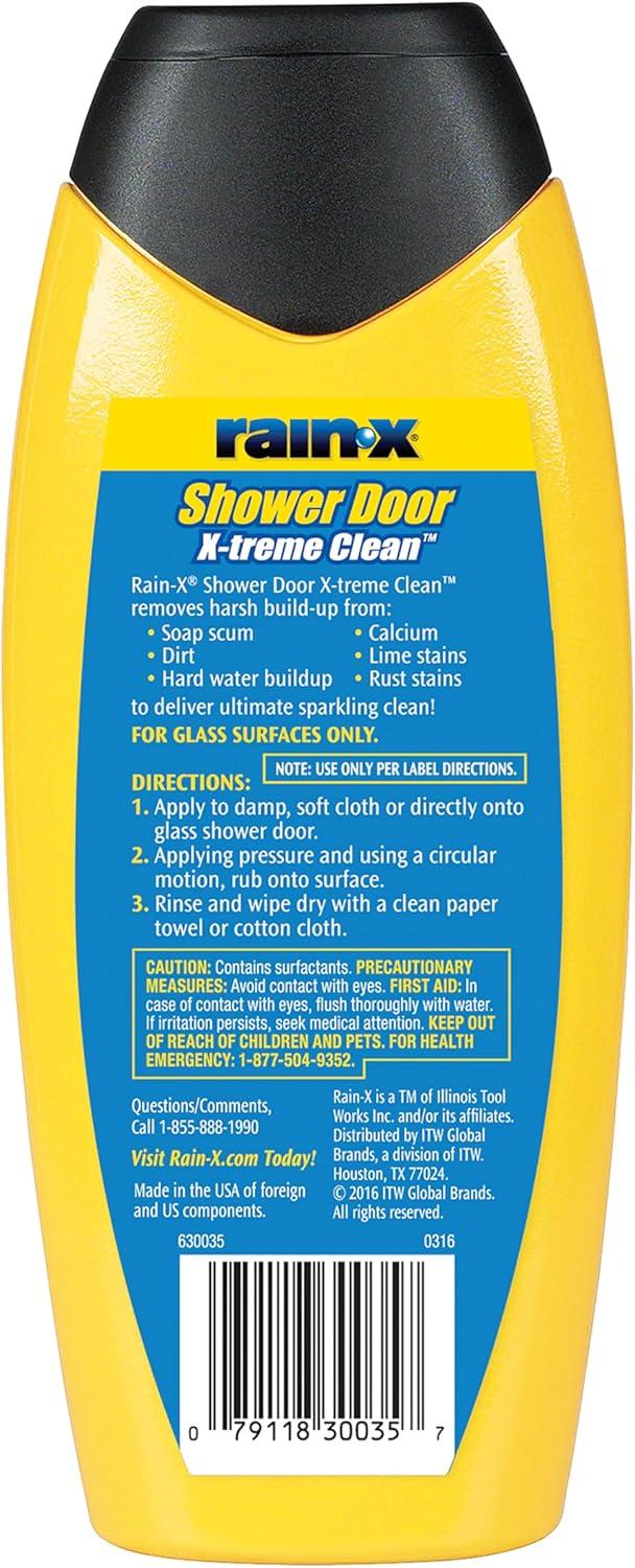 Rain‑X X-Treme Clean Shower Door Cleaner removes harsh build-up on glass shower doors to deliver the ultimate clean and an extreme sparkling shine. This unique product is specially formulated for use on glass shower doors and glass surfaces only, it is ideal for removing soap scum, dirt, grime and hard water build-up, calcium, lime stains and rust stains. It takes seconds and is easy to apply and leaves a durable coating that protects and lasts for weeks making it a stable for your shower cleaning supplies! It's also an ideal prep for using in combination with Rain-X Shower Door Water Repellent: it leaves behind a clean and pristine glass surface to apply the water repellent so the water can bead and slide right off. Directions: For best use – use in a well ventilated area, apply the product to a damp, soft cloth or directly onto your glass shower door. Then while applying pressure and using a circular motion, rub onto the glass surface. Finally rinse and wipe dry with a clean paper towel or cotton cloth.